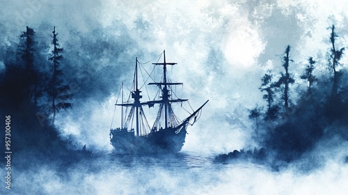 ghostly, ship, sailing, through, mist, gothic, adventure, watercolor, style