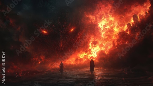 Giant winged demon towering over a lone figure in a fiery landscape. Dramatic lighting emphasizes the immense size and terrifying presence of the creature. Generative AI