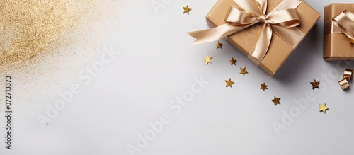 Gift box displayed on a gray table against a white background with mockup gifts. Top view with ample copy space image.