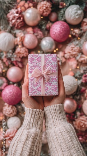 gift, box, pink, ornament, flower, hand, decoration, holiday, bow, present, festive, holding, background, celebration, winter, party, surprise, wrapping, texture, female, cosy, warmth, beauty, design, season, seasonal, cheer, joy, colours, pattern, arrangement, mood
