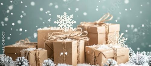 Gift boxes wrapped in kraft paper secured with twine and adorned with paper snowflakes featuring copy space