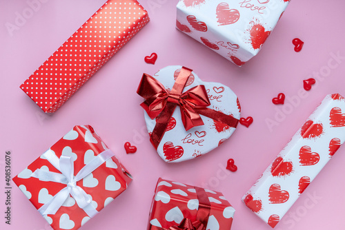 Gift or present box on pink background. for banner. The concept of Valentine Day. top view, copy space