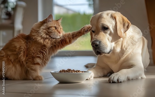 Ginger cat playfully touching yellow Labrador retriever's face as they share moment near food bowl on wooden floor in bright home setting.