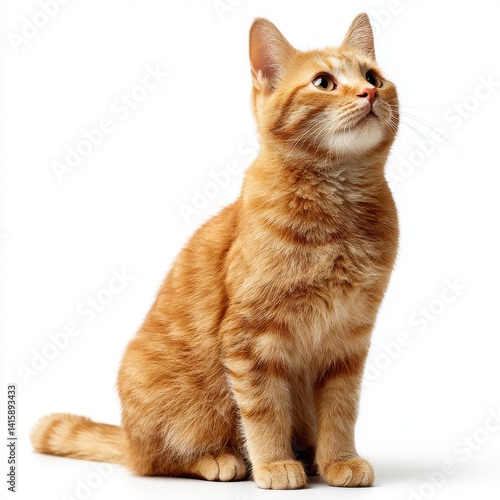 Ginger tabby cat sitting and looking up on white background