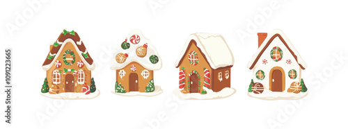 Gingerbread house cookie Christmas illustration. Ginger bread village icon decoration cake. Cute biscuit with icing for New Year dessert drawing element set. Home with door and roof snack isolated