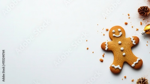 Gingerbread man cookie with festive decorations and crumbs