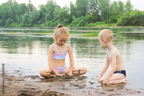 girl and boy playing in the sand by the river, brother and sister are resting in nature