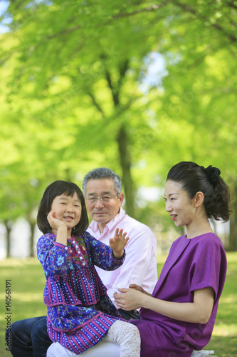 japanese, girl, three people, woman, girl, japanese ethnicity, grandfather, father, daughter, mother, granddaughter, sitting, bench, lap, smiling, playing, childhood, avocation, park, japan, summer, outdoors, photo, vertical, day