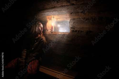 girl by the window in a wooden house with dim light