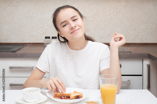 breakfast, girl, woman, morning, healthy, delicious, hot drink, croissant, juice, orange, sandwich, jam, nut, granola, peanut, pasta, fragrant, cereal, diet, toast, bread, homemade, kitchen, white, caucasian, baking, nourishment, food, fresh, fruit, table, yogurt, hot, drink, organic, meal, natural, female, joy, happy, smile