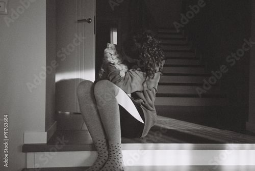 animal, anonymous, black-and-white, cat, film, holding, house, hugging, indoor, lifestyle, sitting, staircase, young
