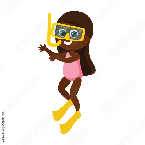 Girl in a swimsuit and snorkeling equipment. Child illustration in cartoon style isolated on white background. Children's activity underwater.