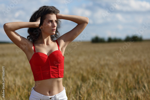 girl, field, wheat, bread, rye, summer, harvest, beauty, beautiful, delight, emotion, freedom, red, nature, sunny, shoulder, cleavage, look, eye, brunette, make-up, young, model, caucasian, charme, charming, irresistable, female, attractive, sexy, sensual, actress, hair, cosmetic, woman, man, space, leisure