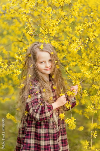 girl in yellow flowers. A child on the background of forsythia. Spring portrait of a child with flowers in her hair