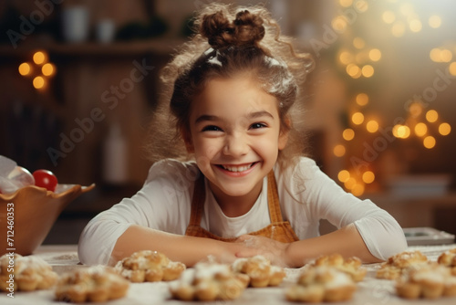 Girl kid, cookies and baking with portrait and bakery skill, learning and development with success and pride. Cookie, dessert and proud child baker cooking in kitchen with achievement and happiness