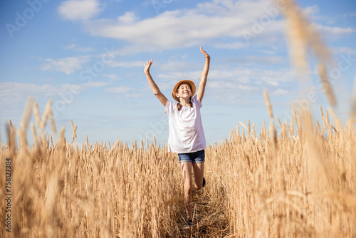 Girl teenager in field on blue sky background, copy space