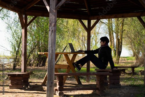 Girl using lap top among nature. Time online. The girl is sitting at the computer in the summer house.