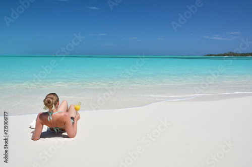 Girl with a glass of orange on the beach of Exuma, Bahamas