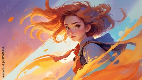 girl, woman, auburn, hair, flowing, sunset, orange, yellow, sky, cloud, face, eye, portrait, style, digital, art, painting, anime, illustration, character, design, fashion, casual attire, clothing, romantic, dreamy, beautiful, pretty, charming, cute, expression, calm, peaceful, colours, warm, light, high-coloured, dynamic, abstract, motion, wind, texture, soft