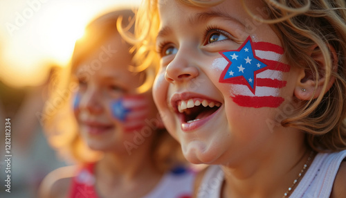 girl, celebration, smile, outdoors, joyful, summer, children, friendship, happiness, emotion, excitement, fun, expression, sun, festival, playful, ethnicity, age, laughter, casual attire, happy, bonding, holiday, face paint, american flag, cultural, festive, vibrant, energy, togetherness, childhood, family, teamwork, carefree, youth, friends, sunshine, colours, warm, oneness, event