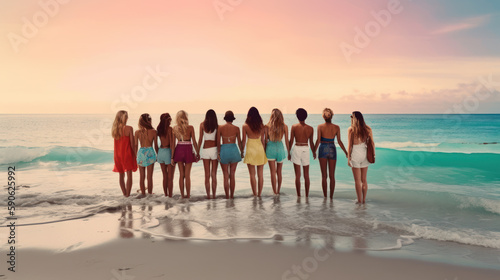 Girls in summer clothes standing on the beach at sunset enjoying their vacations Ai generative.