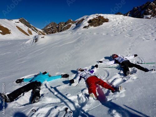 GIRLS LENGTHENED IN THE SNOWDOMAIN OF 4 VALLEYS , VERBIER , VALAIS, SWISS IN DECEMBER 2016