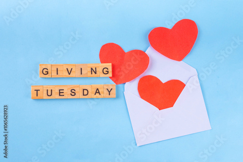 Giving Tuesday, international charity day background with red heart and text Giving Tuesday on blue background top view copy space. Global charitable giving day after Black Friday shopping day