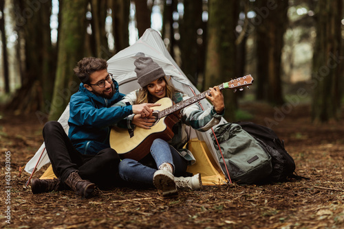 glad, young, caucasian, guy, help, lady, music, lesson, forest, enjoy, travel, vacation, tent, playing, guitar, camping, hiking, lifestyle, adventure, tour tourism, together, couple, jacket, rest, copy space, wild, cold, play, hiker, walking, active, european, holiday maker, season, date, song, woman, man, family, love, human relationships, partner, weekend, autumn, nature, wood, backpack