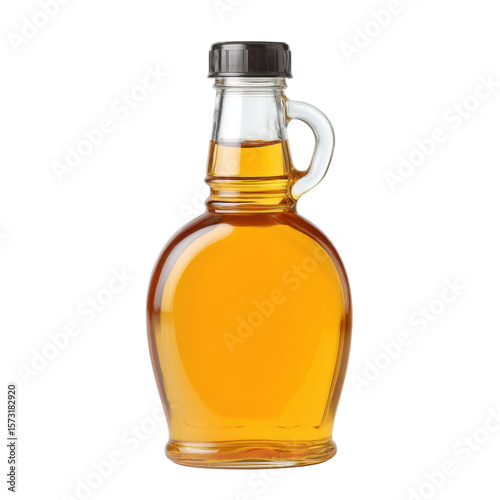 Glass bottle filled with pure maple syrup on a white background for culinary and food design use Transparent background or png