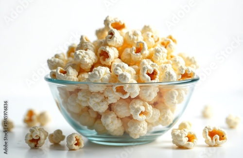 Glass bowl filled with fresh popcorn. Many pieces scattered around bowl on white surface. Tasty snack for movie night or party. Light crispy food.