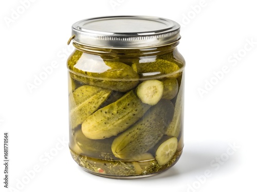 Glass jar filled with fresh dill pickles on a white background