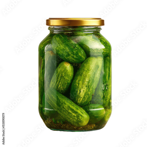 Glass Jar Filled with Green Pickles with Gold Lid and Transparent Background
