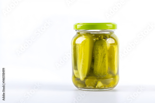 Glass jar filled with pickled cucumbers, isolated on white background. Marinated green vegetables in vinegar brine, traditional preservation method