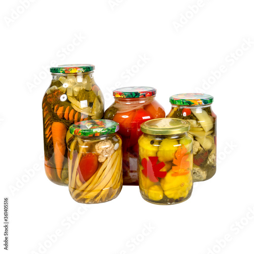 glass jar with canned vegetables isolated on white background.