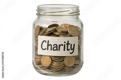 glass jar with coins with charity text written on it