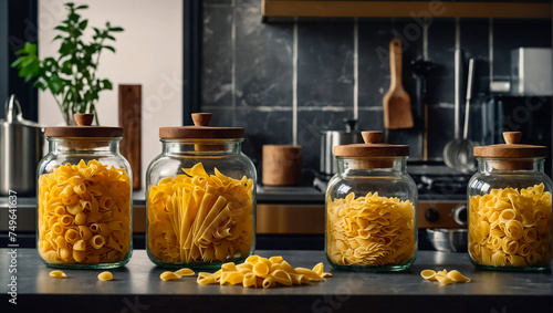 glass jars with dry organic assorted pasta in the kitchen