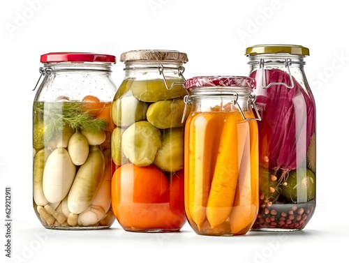 Glass jars with variety of pickled vegetables isolated on white background.