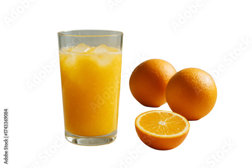 Glass of orange juice with ice cubes next to whole and halved oranges, isolated style on white background. Concept of fresh drink template. Ai generative