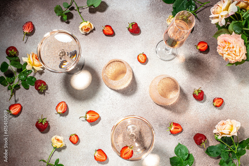 Glasses of delicious strawberry wine with roses, banner, menu, recipe place for text, top view