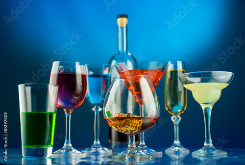 Glasses with alcohol different shapes on a blue background