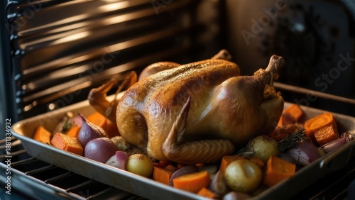 Glistening Golden-Brown Roast Chicken with Vegetables Baking in the Oven's Warm Glow