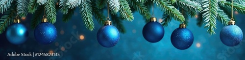 Glittering blue ornaments hang from a frosty fir garland, evergreen garland, decoration, gift idea