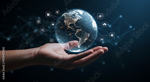global, network, connectivity, technology, digital, hand, holding, globe, sphere, icons, lines, points, light, glowing, blue, dark background, abstract, conceptual, illustration, rendering, graphic, v
