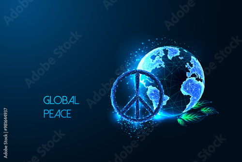 Global peace futuristic concept with peace symbol over planet Earth on dark blue background.