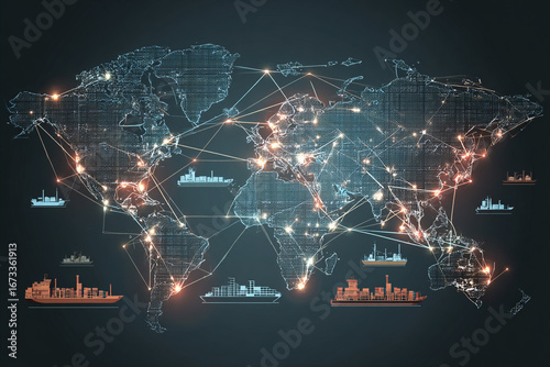 Global shipping network connecting continents via sea trade routes shown on a world map with cargo ships