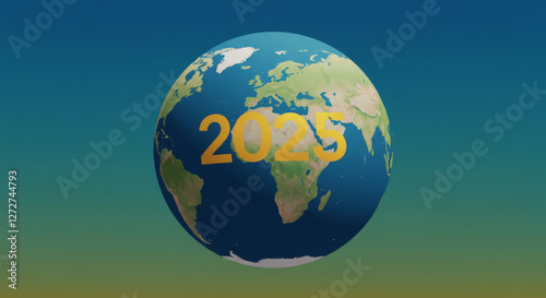 2025, year, concept, globe, earth, earth, continent, map, europa, africa, asia, ocean, sea, illustration, rendering, digital, artwork, geography, sky, background, blue, green, yellow, 20, 5, 22, number, climate, change, future, global, warming, environment, science, technology, perspective, view, land, south, america, north, design, presentation, symbol, artistic, creative, isolated, date