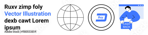 Globe outlines digital commerce, Buy button highlights purchase functionality, Cashback iconizes rewards. Ideal for e-commerce, online shopping, digital marketing, cashback promotions, user