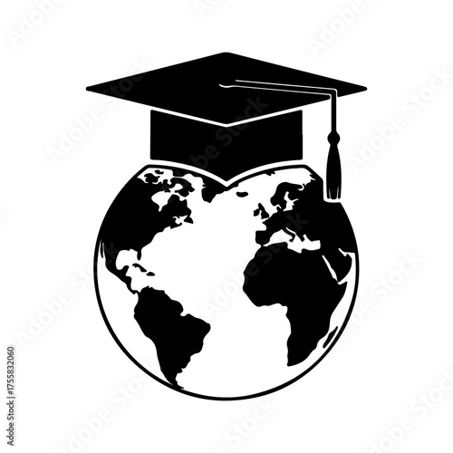 globe, education, graduation, cap, learning, earth, silhouette, isolated, cut-out, transparent, background, academic, school, university, cognition, flat, minimal, symbol, icon, concept, global, studying, teaching, success, achievement, web, mobile, app, branding, print, design, modern, outline, black, white, element
