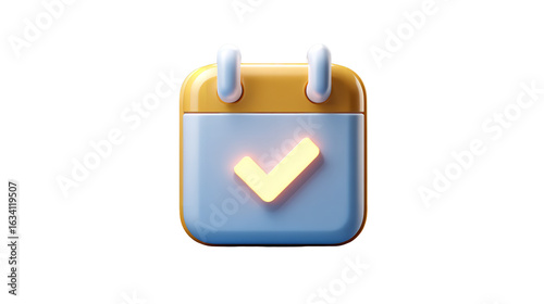calendar, event, appointment, date, schedule, day, month, check, checkmark, icon, symbol, reminder, time, planner, organisation, planning, mark, notification, list, three-dimensional, render, blue, yellow, glossy, shiny, object, isolated, graphic, element, design, cartoon, rendering, task, management, business, corporate, agenda, work, deadline, completed, clear, clean, single, item