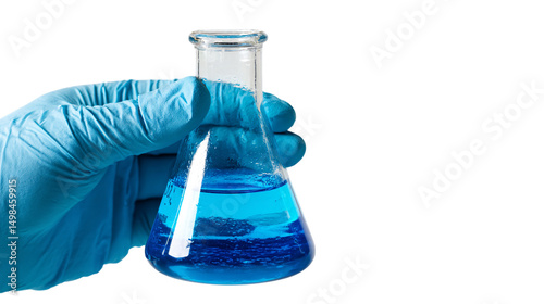 Gloved hand holding Erlenmeyer flask with blue liquid isolated on transparent background